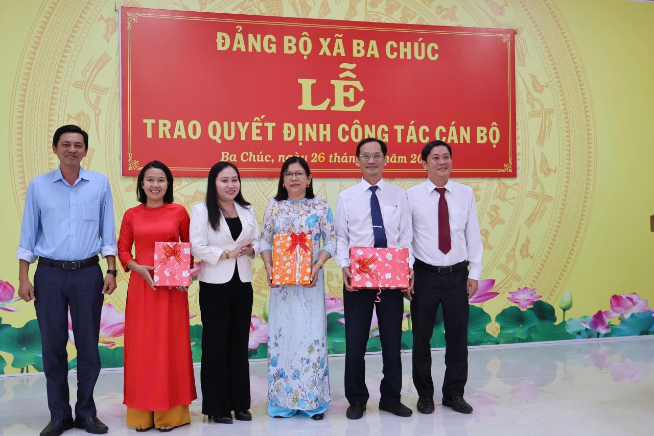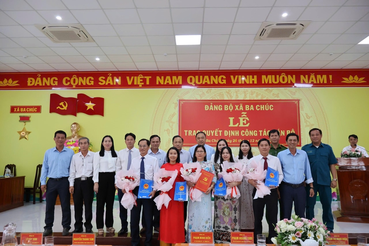 Tại buổi lễ, lãnh đạo Đảng ủy xã đã công bố quyết định Bổ nhiệm ông Phan Bá Phước, Phó Chánh Văn phòng HĐND và UBND xã, giữ chức vụ Chánh Văn phòng HĐND và UBND xã. Thời hạn bổ nhiệm là 05 (năm) năm; Bổ nhiệm bà Võ Thị Yến, Công chức Văn phòng HĐND và UBND xã, giữ chức vụ Phó Chánh Văn phòng HĐND và UBND xã. Thời hạn bổ nhiệm là 05 (năm) năm; Điều động và bổ nhiệm bà Huỳnh Thị Uyên Phương, Phó Trưởng Ban Văn hóa - Xã hội Hội đồng nhân dân xã Ba Chúc về công tác tại Phòng Văn hóa – Xã hội xã Ba Chúc, giữ chức vụ Phó Trưởng phòng Văn hóa – Xã hội, thời hạn bổ nhiệm là 05 (năm) năm;Phê Chuẩn Ông Ngô Hữu Hạnh giữ chức phó trưởng ban Văn hóa – Xã hội HĐND xã Ba Chúc khoá I, nhiệm kỳ 2021- 2026; điều động đồng chí Nguyễn Thị Máy nguyên UVUBKT Đảng Uỷ xã Ba Chúc, nhiệm kỳ 2025 - 2030 đến công tác tại Ban Xây Dựng đảng Đảng uỷ Xã Ba Chúc; đồng thời bổ nhiệm giữ chức phó trưởng ban xây dựng Đảng, thời hạn bổ nhiệm 5 năm; đồng thời trao quyết định và chúc mừng cán bộ được điều chuyển nhận nhiệm vụ mới.